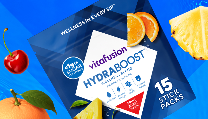15 single-serve packets of vitafusion™ Hydraboost Wellness Blend in Fruit Burst, a daily wellness support drink powder that supports hydration, cellular energy, gut and immune health with 11 essential vitamins and minerals.  Orange, pineapple, and cherry come together to create a fruit burst flavor that hits just right!