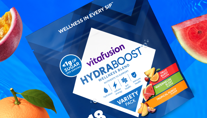 18 single-serve packets of vitafusion™ Hydraboost Wellness Blend, a daily wellness support drink powder that supports hydration, cellular energy, gut and immune health with 11 essential vitamins and minerals. The variety pack allows you to try every flavor with six packets each of Fruit Burst, Watermelon Blast, and Tropical Punch flavors that hit just right!